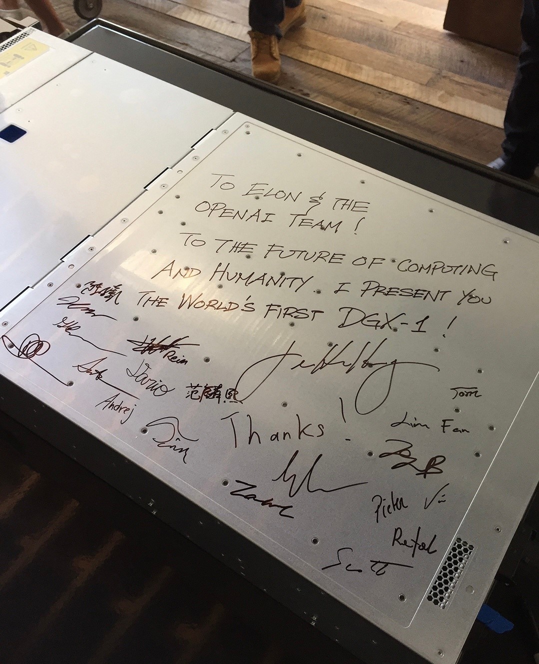 “给埃隆和Open AI团队。为了计算和人类的未来,我捐出世界上第一台DGX-1。”