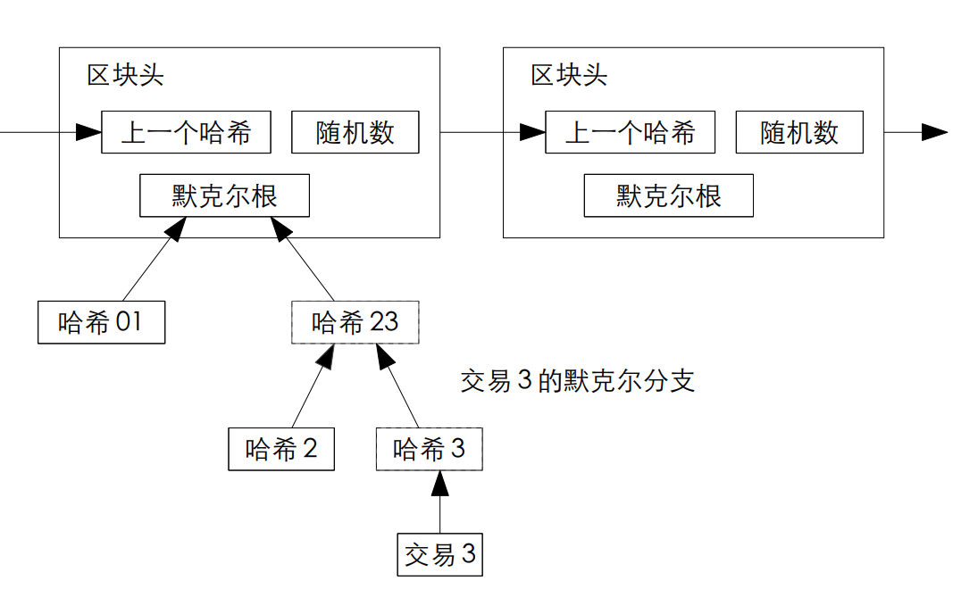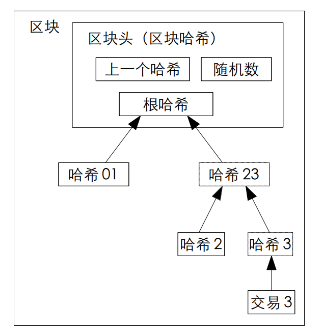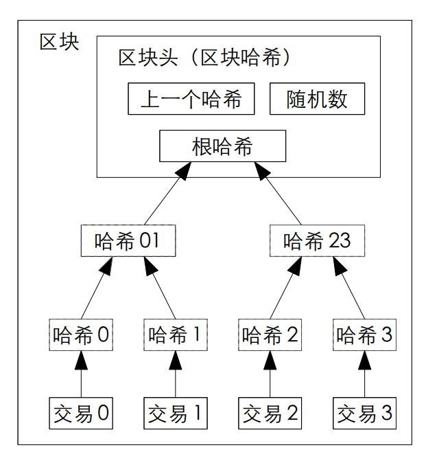 树的其他层,包括根部都是哈希值。树根部的哈希值是通过叶子节点的交易数据一层一层哈希得来的。